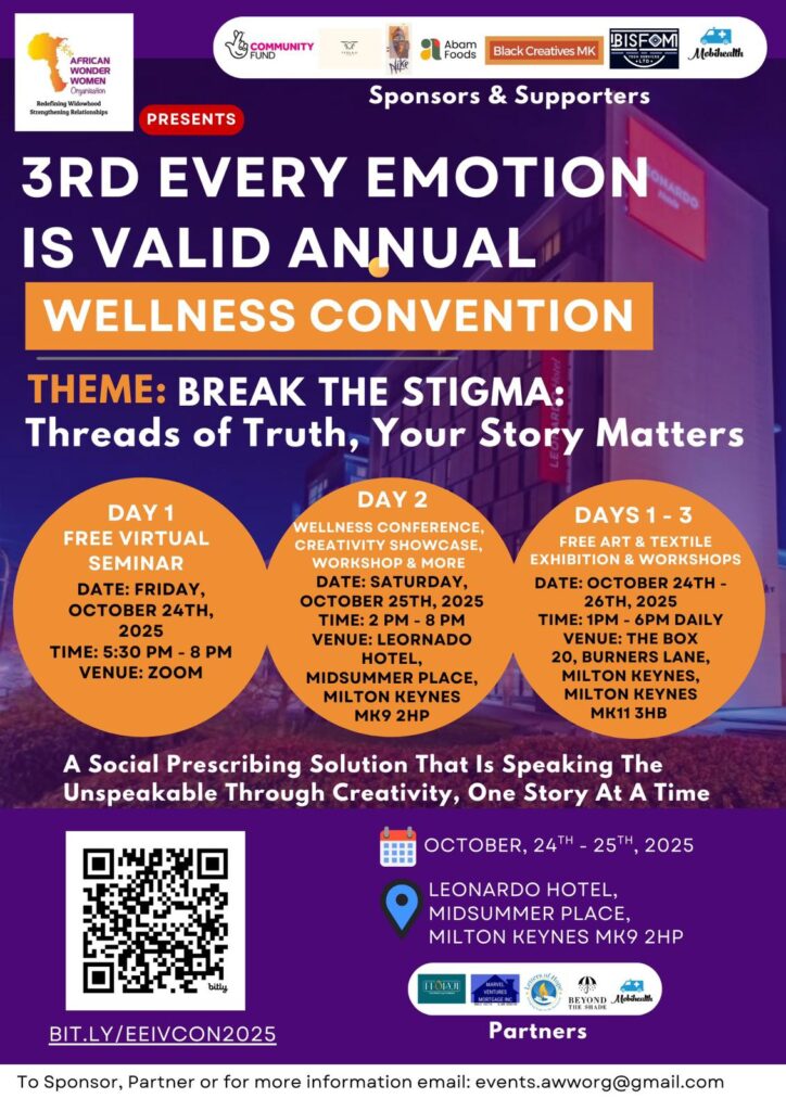 Due to popular demand, African Wonder Women Organisation CIC is hosting our very first Face2Face ‘EVERY EMOTION IS VALID’ (EEIV) Convention in Milton Keynes. The convention is set to host over 100 attendees.